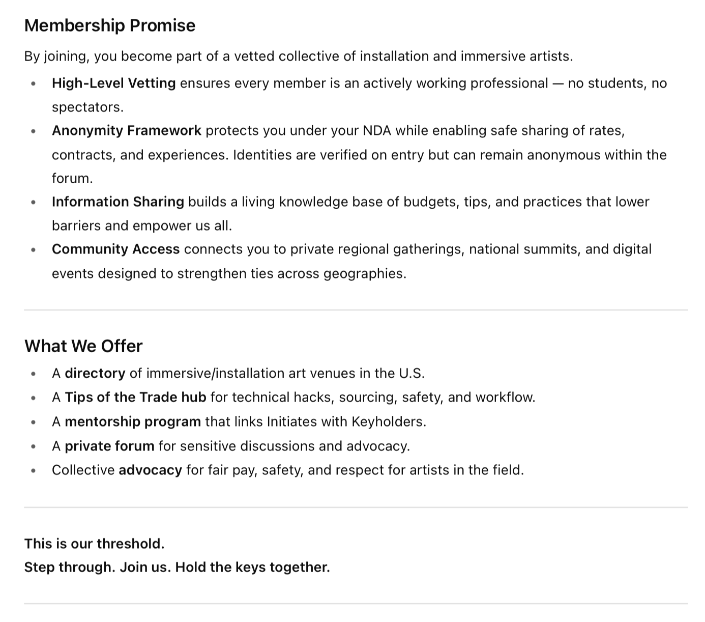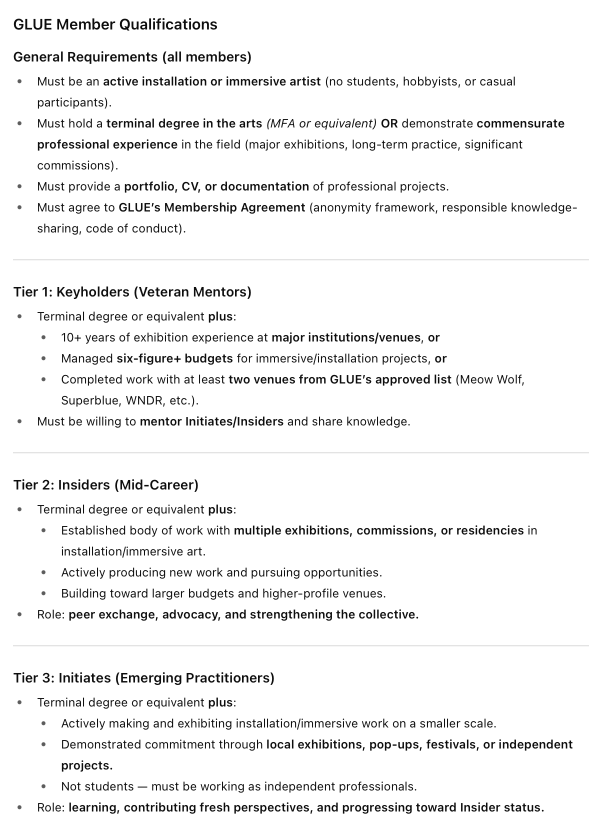 GLUE MEMBERSHIP is free and gives you access to a vetted community where installation and immersive artists exchange insights on budgets, processes, and professional practices on a private forum. By joining, you gain clarity from peers’ experiences—shared in ways that protect individual privacy and respect legal agreements. We verify credentials behind every member application. No corporate entities allowed. This is where we take back the keys to our creative power.