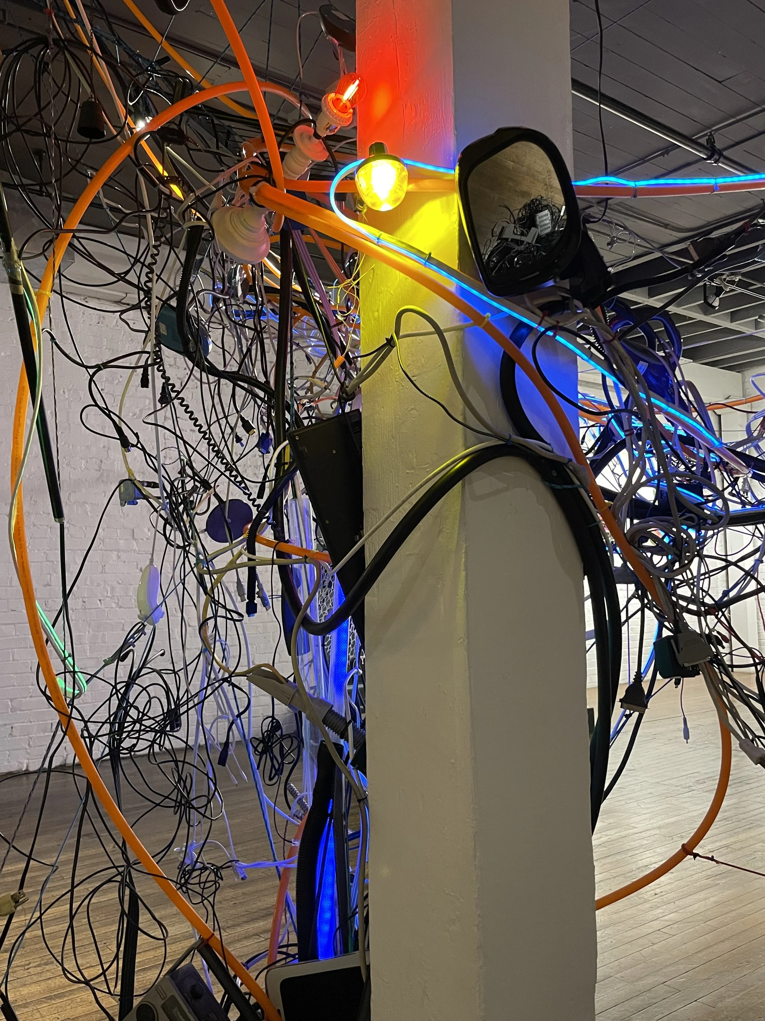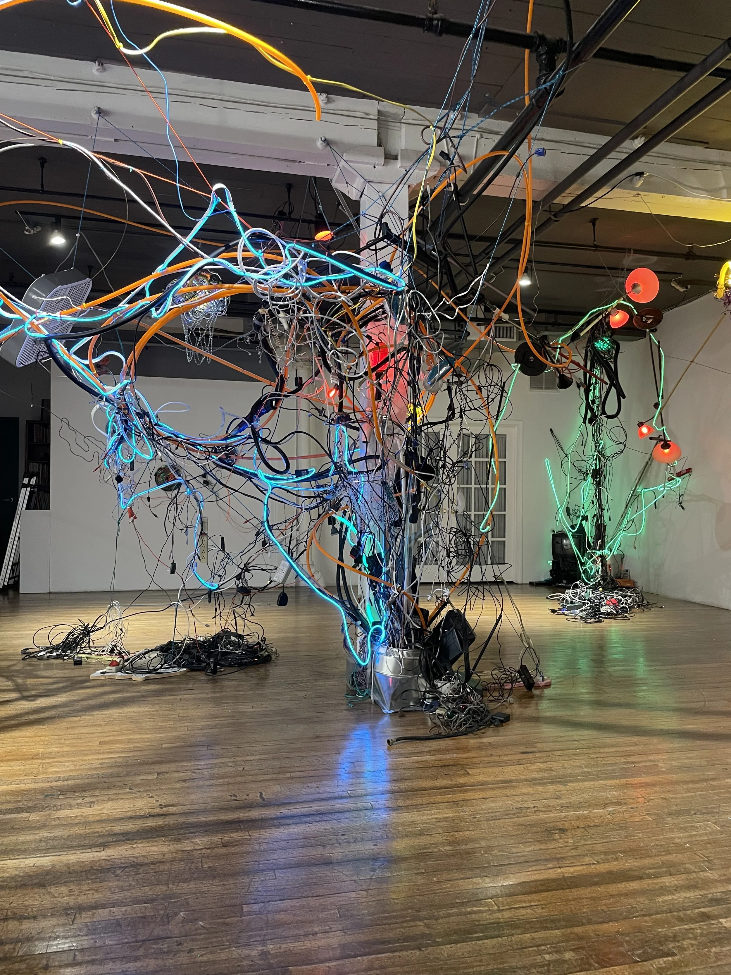 The art in this show is built from discarded electronics — broken keyboards, coiled wires, obsolete software, bundled cables, and more. It’s work that began in my heart decades ago. If you want to see a couple photos from that show, scroll down to the end of this post.
