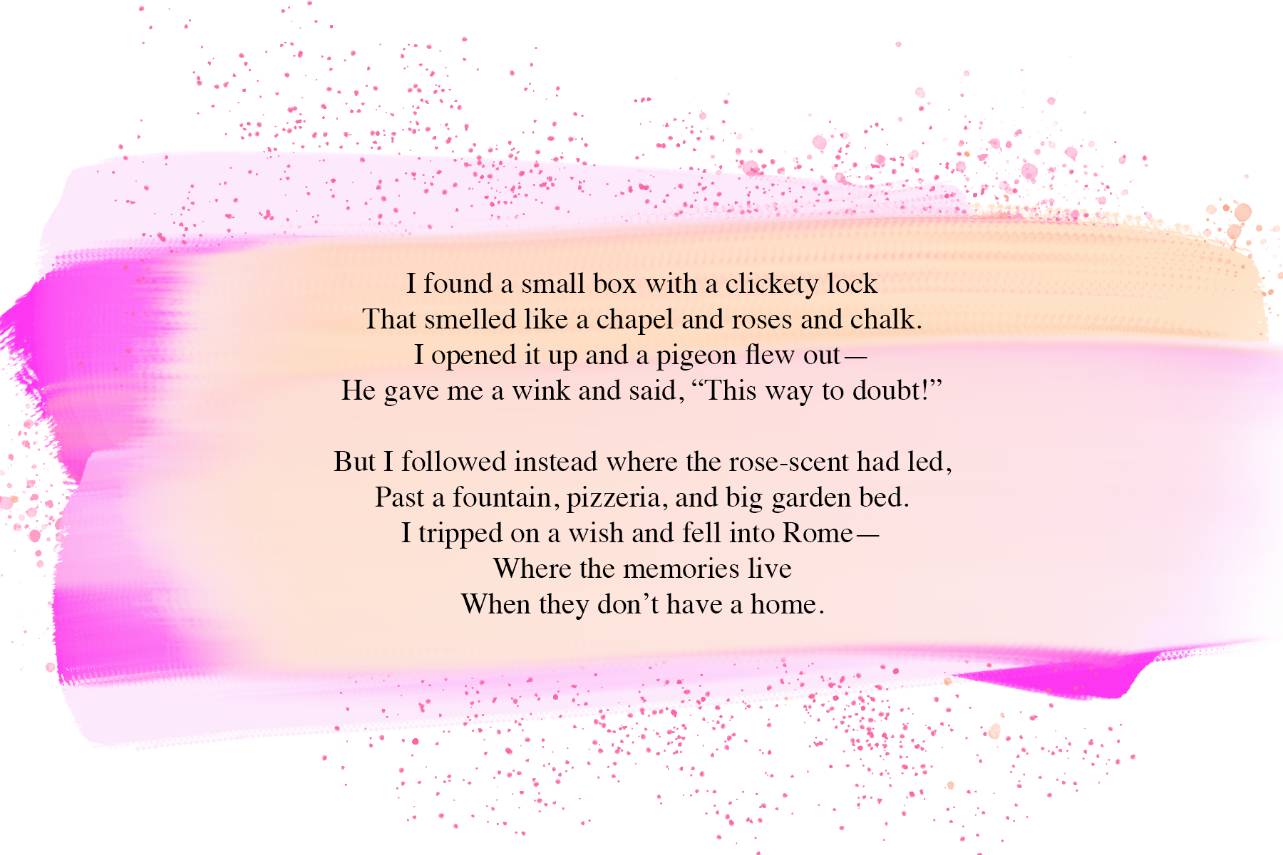 A soft blow, a sweep of the right hand over left palm, open, and we enter Italy through a little pink box.