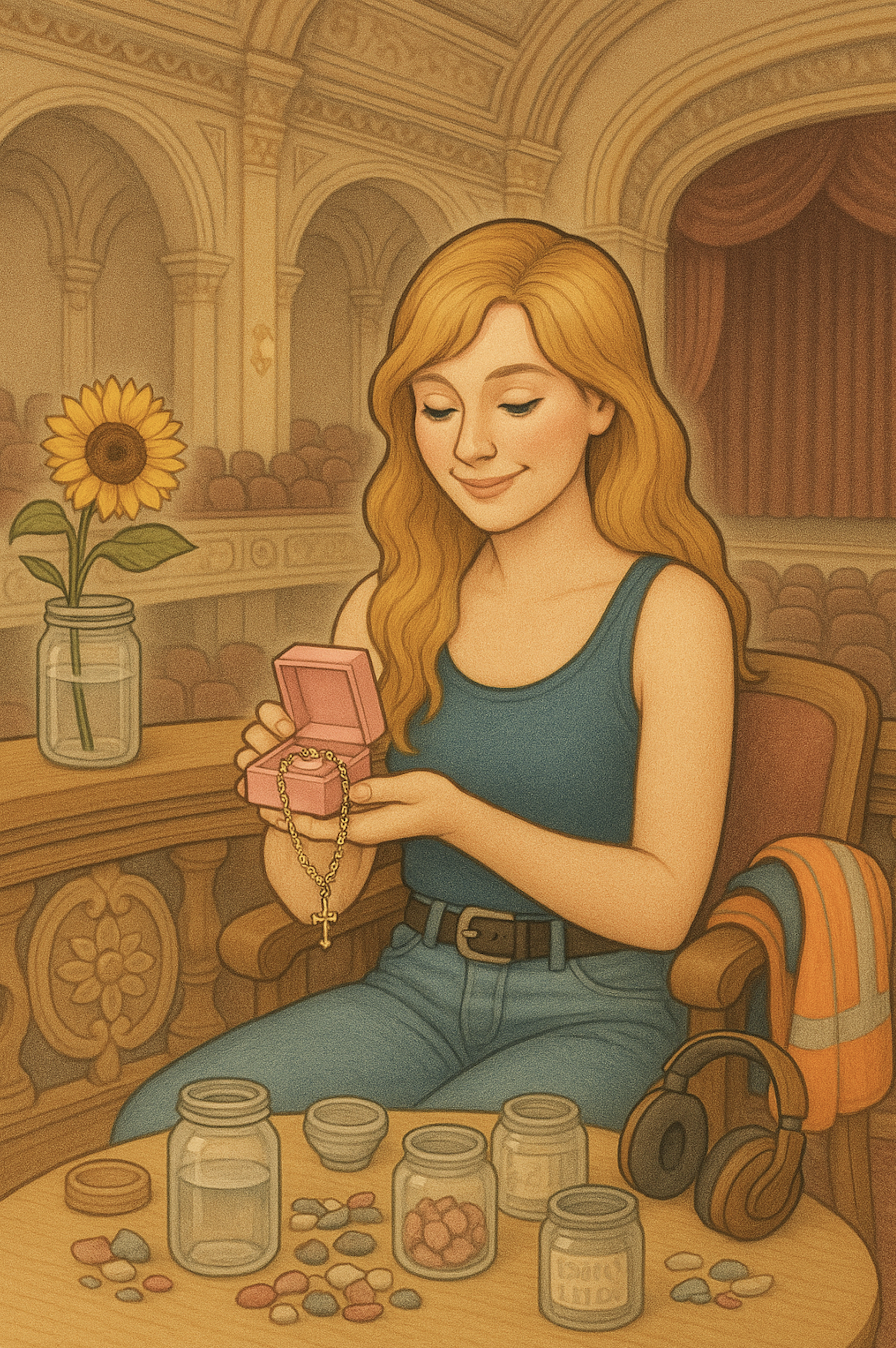 The box was smooth, cold, heavy for its size. It warmed up quickly in my hands as I opened and observed it in the midday sun. I couldn't ignore its inner fragrance, similar to my Granny's rose perfume, beckoning me closer. I held up the rosary, it was golden with pale pink beads linked together. I purchased and stuffed it in my green leather bag with other "important" things: a sixpence and rose quartz that were gifted to me, a tiny sculpture of the Buddha for protection, a crumpled napkin for unexpected tears, a mesh bag with another rosary from my Granny that was black chain with translucent red, heart-shaped beads, two halves of a walnut shell with pictures drawn on them (gifted from a friend), my tiny sketchbook, pens, and some money. I don't think I even had a phone. I would get phone calls on the shared landline mostly, and there was a time limit on that. My grandma would joke about how many numbers it would take to dial me, and I would coil the cord between my fingertips and laugh.